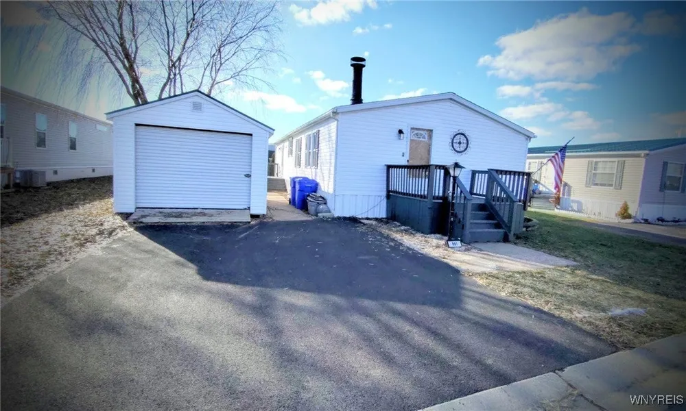 This 2005 Fleetwood double-wide manufactured home is located at 861 Birchwood Drive in The Woodlands in Lockport NY. The area outside of this home has many desirable qualities. Offering plenty of room for parking & storage with a new blacktop driveway wide enough for two vehicles as well as a 1 car garage (12 x 20 installed in 2018) and a shed in the backyard; comfortable sitting areas on the freshly painted front porch and side porch; and a nice size yard area surrounding the house. The roof is only 2 years old & A/C unit is only 1 year old. Inside offers 1250 sq ft of warm and welcoming living space with 3 bedrooms, 2 bathrooms, kitchen, dining room, living room with a fireplace, family room, and laundry area. The master bathroom has a beautiful newly built walk-in tile shower and new toilet, and the master bedroom has a walk in closet. There is a nice wooden ledge recently installed with three stools between the dining room and kitchen that could be used as a breakfast/coffee bar. Every room has been recently updated with installation of brand-new carpeting & luxury vinyl flooring, freshly painted walls & ceilings, and decorated with coordinating window treatments & wall decor (included with the home). Some of the many perks include a brand new electric hot water tank; existing washer & dryer, gas stove, microwave, dishwasher, and refrigerator; double pane Window World vinyl windows; updated light fixtures (inside & outside), and more...