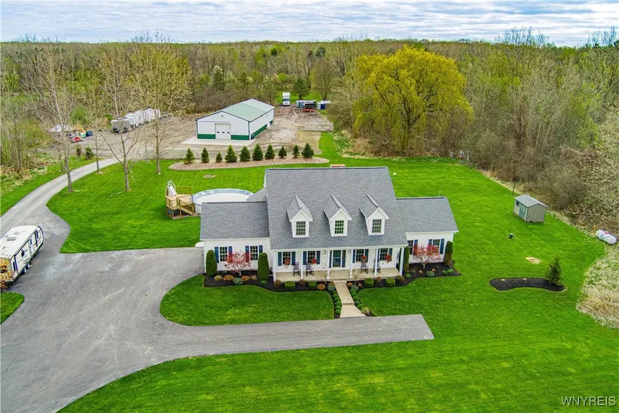 Pristine and well maintained custom home on 16.8 acres. 5 bedrooms with 3.5 bathrooms. Welcoming 2 story foyer. Dining room and den. Large and inviting great room with built-ins and gas fireplace. Kitchen with granite counters, wine frig, island with seating and eating area with a view! First floor primary bedroom with cathedral ceiling, walk in closet, ensuite with jetted tub and walk in shower. Second floor with 4 bedrooms w/ expansive closets. Full bath w/double sinks. Basement w/ finished room with full bath. Gathering room with TV, wet bar and refrigerator. Laundry rm, and storage rm. 2 car attached garage w/ pull down stairs. Patio (2024) with Apollo epoxy finish. Awning covered w/ wet bar and TV for summer entertaining. Pole barn. Metal with heat, water, and electric. 40x94. 2 Sections. 4 overhead garage doors in total. One side with one garage door and 2 story storage. Other side...