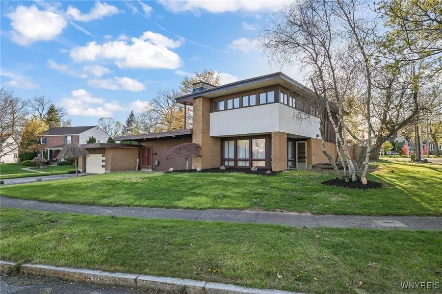 Evoking the spirit of Frank Lloyd Wright, this one-of-a-kind architectural masterpiece offers over 2,900 sq ft of artfully designed living space in the heart of the sought-after Deveaux neighborhood. Just a 5-minute walk to Niagara Gorge trails & Deveaux State Park, and a scenic bike ride from Niagara Falls itself, this residence seamlessly blends timeless character, inspired design, and a prime location. Situated on a corner lot, the home welcomes you into a striking open-concept main level featuring a spacious living room w/ wood-burning fireplace (gas assist), built-in wet bar, and a recently updated kitchen adorned w/ quartz countertops. The dining room showcases hardwood floors, and a convenient 1/2 bath is tucked near the front entrance. A rear hallway leads to 1st floor laundry, two bedrooms, and a full bath. Upstairs, the oversized primary retreat includes a walk-in cedar closet,...