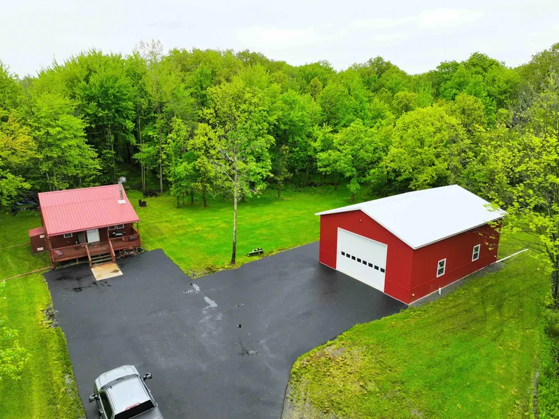 This cabin and large pole barn sits on 73.3 acres located in Barker NY.