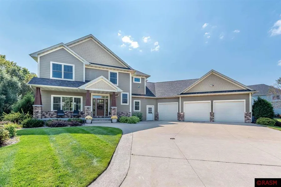 Discover the elegance and charm of this meticulously crafted custom home in Upper North Mankato, nestled on a stunning half-acre ravine lot. This thoughtfully designed 2-story residence immediately captivates with its beautiful details and superior finishes. From the moment you arrive, you'll be impressed by the striking curb appeal, featuring a welcoming front porch with Craftsman-style columns, stylish stone accents, and mature landscaping. The main floor offers a seamless flow, starting with a foyer that includes a coat closet, half bath, and stylish hard surface flooring that extends into the kitchen and dining areas. The spacious living room showcases a stunning stone fireplace, a den/office, and an open-concept layout connecting the dining and kitchen spaces. The chef's kitchen is a highlight with its custom cabinetry, Cambria countertops, stainless steel appliances, large pantry, ...