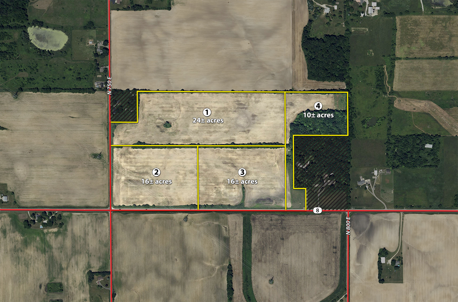 Tract 2: 16 ac of mostly tillable farmland. This tract has a more rolling topography. Road frontage off of N 750 E and St Rd 8, great potential building site. Farming rights in 2026.