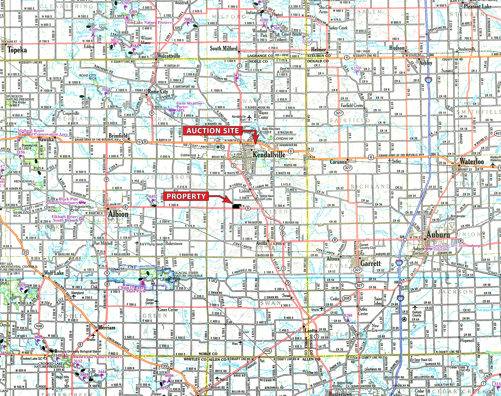 Take St Rd 8 East out of Albion, IN. Continue east for 7.5 miles and arrive at N 750 E. Turn North and the property is located on the East side of the road.