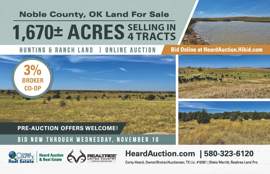 This Billings acreage in Noble County, OK will be sold via ONLINE ONLY AUCTION with bidding starting October 13th, 2021 and ending November 10th, 2021. Great hunting and grazing with tons of ponds. Just a few minutes west of I-35 and a short drive east of Enid, OK!