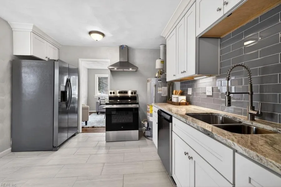This lovely 3 bedroom rancher, with a giant backyard & detached garage, is a renovated dream! Kitchen is made gorgeous with stainless steel appliances, granite counters, and popular subway tile backsplash. Bathroom shows off beautiful vanity and cool clean color scheme. Nice-sized living and dining areas that fill with tons of beautiful natural light from the windows. Nice front landscaping for cute curb appeal. Gas stove hook up available. Nice hardwood floors. HVAC & Hot Water Heater are both 2025. Located conveniently near popular shopping and eateries! This home has it all!