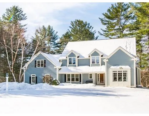 Exceptional custom colonial set on 3 private acres in a sidewalked cul de sac abutting the Grist Mill and Kingsbury Pond. Sophisticated upgrades and subtle finishes abound. This home showcases: nine foot ceilings, entry w/custom coat room, quarter-sawn hardwood floors, windows with transoms, built-ins, and refined millwork and moldings. Also featuring: chef's eat-in kitchen with desirable butler's pantry, granite counters, stainless appliances, and custom island. Spacious formal dining room with wainscoting. Large fireplaced family room w/ flamed granite surround, built-ins and French doors to private composite deck. Sun-filled living room wall of windows and French door to deck. Study with fireplace, striking millwork arch and built-ins. Large first floor laundry and powder room. Four spacious bedrooms, master bath w/double vanity, solid surface counters and soaking tub, and guest suite w/vaulted ceiling. Finished basement. Fishing and skating on pond. Walk to schools and town center.