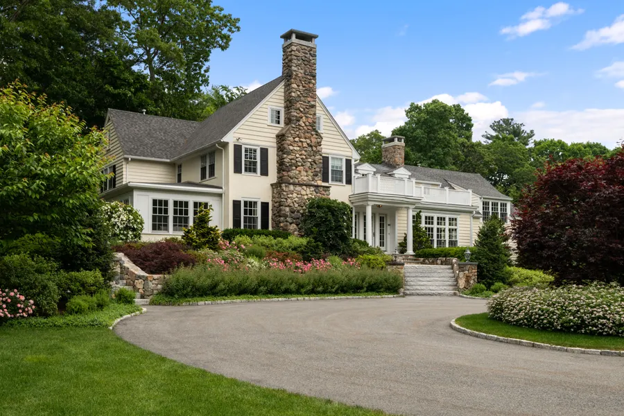 Timeless design and a stunning, serene setting combine in this beautiful Farms estate. Majestic landscaping surrounds the circular driveway leading to the elegant front entry foyer. The sophisticated fireplaced living room with custom millwork leads to the sunroom with walls of windows overlooking the impeccable grounds. The generous formal dining room leads through the oversized butler's pantry to the expansive kitchen with high-end appliances, an oversized island and an eat-in area with a fireplace. The fantastic family room with coffered ceilings, grand built-ins and an exceptional view of the grounds is a perfect gathering place. The private primary suite with cathedral ceilings is adjoined by a marble bath featuring a double vanity, soaking tub and radiant floors. Three additional bedrooms and two updated full baths complete the second floor. The third floor offers an excellent guest suite or home office area. The finished lower level offers even more space! The sprawling bluestone patios are surrounded by manicured gardens offering beauty at every turn.