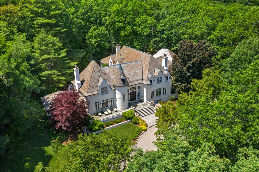 Exquisite estate offering sophisticated grandeur in an idyllic setting is a modern retreat with plentiful space inside and out. The stunning double height foyer leads to the beautiful front to back living room featuring a double sided fireplace. The sunroom with soaring ceilings offers fantastic bonus gathering space and views of the impeccable grounds. The striking library with built-ins and beautiful pocket doors is excellent work from home space. The elegant dining room leads to the gleaming kitchen featuring top of the line appliances, marble countertops, a window seat and a generous eat-in area. Spectacular views in the expansive family room and an exquisite guest suite with a terrace complete the first floor. The luxurious primary suite features a fireplace, dressing area and a sprawling marble bath with a steam shower. Three sizable en suite bedrooms complete the second floor. The lower level features bonus space and an additional bedroom/bath. The sweeping patios offer magnificent entertaining opportunities. Chic, refined style at its very best!