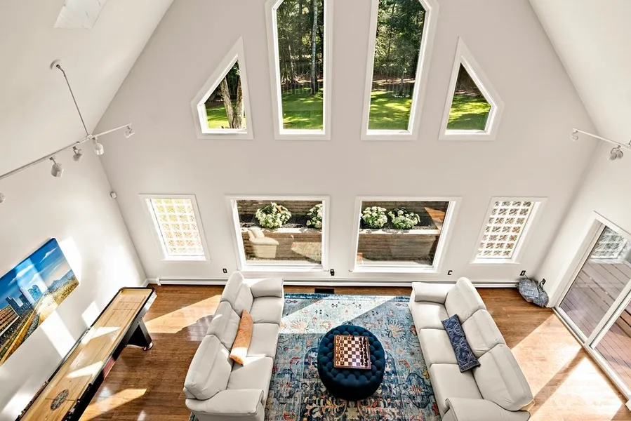 One-of-a-kind home in a quiet & tranquil area close to Sharon Center. Luxurious amenities, open spaces with high ceilings, gallery lighting & oversized decks, patios & gorgeous landscapes. Upon entering you are greeted by an expansive vaulted-ceiling fireplaced living room leading to an entertainment sized dining room and a heated three-season sunroom. Large 2-story family room with walls of glass. Oversized kitchen has quartz counters, a 6-foot refrigerator, two dishwashers, ovens, gas cook tops and sinks with loads of cabinet space. Walk in pantry closet. Master suite on top floor of main wing with walk-in closet, master bath, a balcony overlooking the family room and a walk out deck with hot tub. 3 bedrooms in one wing off the living room. 5th bedroom in spacious basement level. 2 large office spaces, theatre room and personal gym. Heated bamboo flooring throughout. Four decks/patios ...