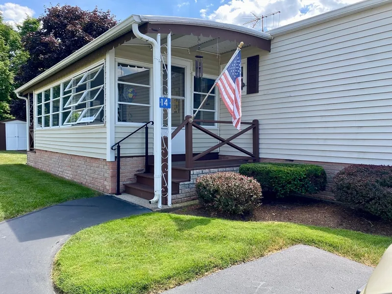 The first time ever available, 14 Elliott Dr. is an impeccably maintained mobile home in beautiful Sunset Acres, a 55 community conveniently located off Route 1 in Plainville. Beautiful flowers, shrubs and landscaping throughout this community, reflecting pride of ownership, and this home is no exception. Welcoming 3 season front porch off 2 car driveway- a smart layout includes an accommodating kitchen, complete with breakfast bar for two, opens to large living room, (with tip out for added space). At the back of the home is a large bedroom, washer/dryer, back door, and full bathroom with sparkling vanity, and spacious walk in shower, framed w/ glass doors. An additional bedroom, or den, is located at the front of home, with large bright windows and dbl closet. Thoughtfully designed and constructed with added insulation, premium carpeting, Harvey replacement windows, hot water baseboar...