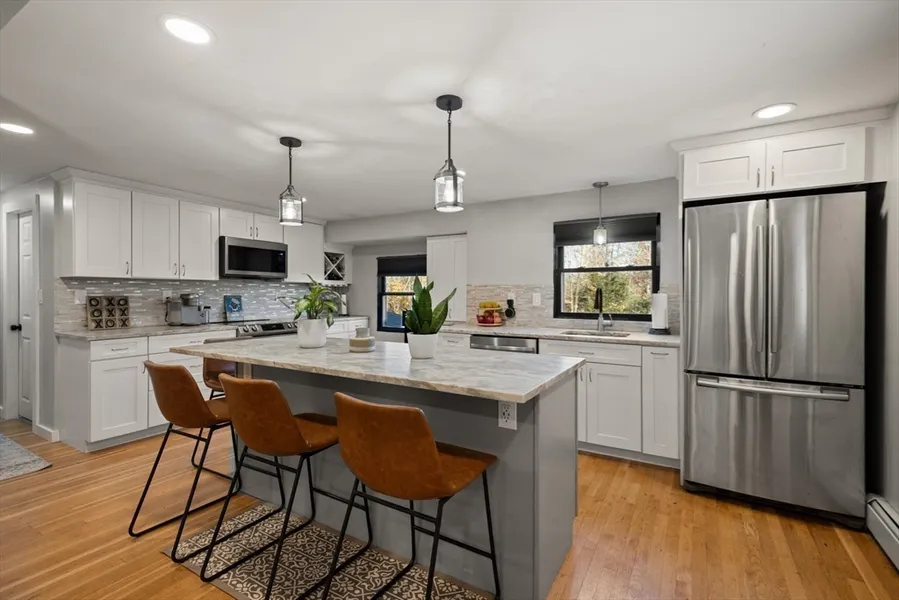UPDATED, SPACIOUS AND SUN DRENCHED! Welcome to Foxboro! This charming ranch home boasts a remodeled kitchen with leathered granite, a large island with all new cabinetry, and stainless steel appliances! The upstairs offers three spacious bedrooms. Hardwood floors gleam throughout the main floor! The top floor provides a beautiful, remodeled full bath. The finished basement offers vinyl plank flooring and a half bathroom. The basement is perfect for a playroom, office, or flex space! Not to mention there is a fabulous three-season room! A one car detached garage, deck and a spacious gardening shed all sit on 1.5 acres of land! Heating system, septic system and vinyl siding are only 4 years old!! A COMMUTERS DREAM with a train station and highways less than 5 minutes away! Don't miss out on this amazing property, it will not last! First showings at Open House 12/8/24 1-2:30pm.