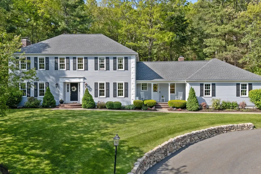 A Rare Blend of Serenity and Prime Location. Set at the end of a quiet cul-de-sac just 1.5 miles from the town center, this beautifully maintained home offers privacy, space, and a peaceful setting on 1 acre near Farley Pond and the town forest. The nicely landscaped backyard creates a serene outdoor escape. Inside, the open-concept kitchen and family room feature a stunning stone fireplace, a center island, and abundant storage. A formal entry with two coat closets opens to spacious living and dining rooms—ideal for entertaining. The main level includes two half baths, flexible living areas, and laundry—a bright first-floor office with peaceful backyard views—perfect for working from home in comfort and quiet. The finished lower level includes a full bath, guest bedroom, large play/TV area, and a kitchenette—ideal for guests, an au pair, or a teen suite. An exceptional mix of nature, space, and location, this home offers comfort, style, and effortless living, all just minutes from local amenities.