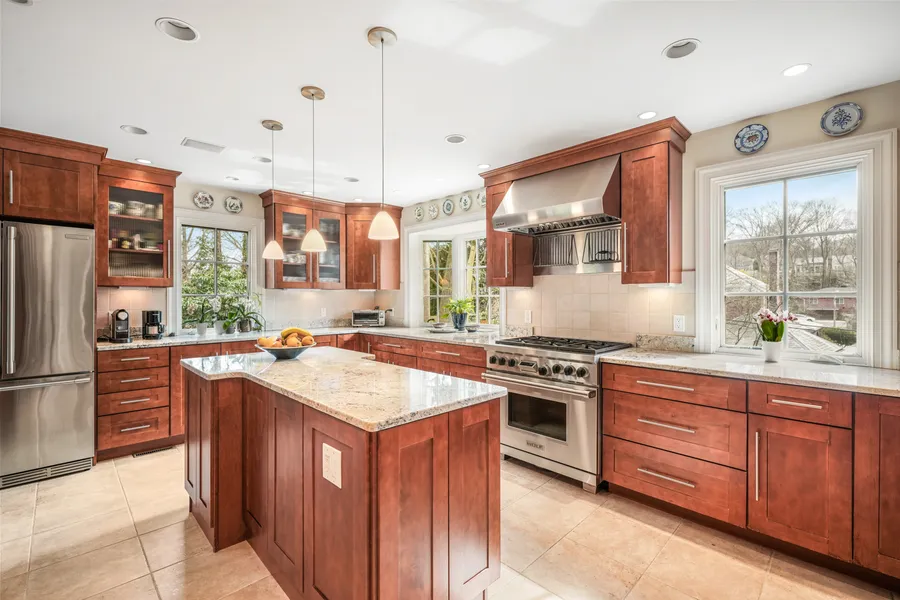 Charming 4-bed, 3.5-bath brick Colonial tucked on a quiet, sidewalk-lined street in Brookline’s sought-after Chestnut Hill/Fisher Hill neighborhood. Set on manicured grounds with lush plantings and an inlaid granite patio, this home offers timeless curb appeal. A welcoming center-entrance foyer opens to elegant living spaces, including a formal living room, sunlit home office with garden views, and a stylish powder room. The renovated eat-in kitchen features a cozy breakfast nook and flows into a spacious dining area with large windows. The generous fireplaced living room opens to a private covered deck with stairs to the granite patio and gardens below. The sun-filled home features beautiful windows throughout. The primary bedroom includes an ensuite bath and walk-in closet. The finished walk-out lower level offers a second office, fireplace, artist’s studio, full bath, and ample storage. Walk to Cleveland Circle, shops, and the Chestnut Hill Reservoir. 2 garage parking.