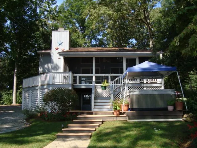 Embrace the wonderful wide view of Pea Hill Creek from the huge screened porch at this delightful home where the sandy beach is just steps away next to the two slip closed-in boathouse with Tiki bar and 7' water depth. The main level has 3BR & 2 BA. The living area has lovely oak floors & has had a major makeover. The living room has a gas log fireplace and is adjacent to the dining area with sliders to the deck & porch. The kitchen has custom cabinets and joins the great room with an eating bar. The high ceiling allows for lots of light in this great room area. The upper level, which is a great place for the kids, has a reading/TV/craft room with skylight and built in desk with shelving, and two undesignated rooms used now as bedrooms and a full bathroom. Lower level is used for workshop & storage of boat toys but could be finished. Great location close to Food Lion & restaurants.