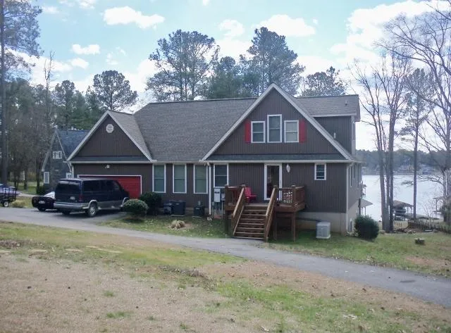 Waterfront home with lovely views of Lake Gaston's Main Lake. This 2876 sqft homes main level enjoys 2BR/1BA, eat-in kitchen w/ bar that seats 4, gas log FP, living room w/ access to lakeside deck & screened porch. The upper level has 2BR and large ceramic tiled BA. Full-finished lower level w/ addl rooms for guests or office, large family room area w/ access to lakeside patio. Throughout the home youll find hardwood, tile or carpeted areas along w/ pocket doors. Circular paved driveway, double attached garage, addl storage space for the water toys or garden supplies. Full house generator that automatically comes on when the power goes out. Lakeside fire pit & sitting area. Gently sloped lot to water and single boathouse.