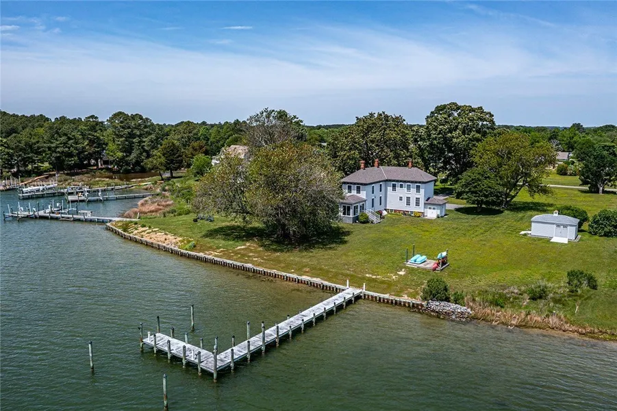 Slip back in time at this quintessential 1900's Bay property. Once you turn into the drive to face the classic front porch nestled under the massive southern magnolia, your cares will float away! This charming 2,492 SF farm home is perfectly sited on 1.43 AC, and conveys all the charm of its early beginnings but with modern comforts for maximum enjoyment! Suitable for a primary residence, get-away home, AirBnB, or a Bed and Breakfast. A main level bedroom and bath, along with four second story bedrooms and two additional full baths, offer plenty of space for overnight stays. The main level has a cozy living room, a very spacious dining room, a modern kitchen, a four seasons room with surrounding windows overlooking the rear yard to a fabulous wide water view over Harvey Creek out to Ingram Bay. Gorgeous wood floors on the upper level show off their patina; carpeting on the main floor keeps things soft and comfortable. Step out on the second story front porch to enjoy shaded breezes while waiting for guests! A partial basement houses the easily accessible mechanical systems and offers extra storage space. A recent complete encapsulation was done in the crawl sections under the home. Meticulous maintenance has kept this house in sound condition. Outside, the backyard stretches along an extended shoreline with a private dock. A small section of sand beach provides easy entry for swimming or kayaks. A large, sweeping maple tree keeps the yard cool in the summer, with a rope swing adding even more charm! A modern shed will hold all your yard equipment and water toys. No HOA; private well and septic. Close to Ingram Bay Marina; minutes to Kilmarnock!