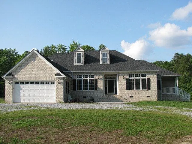 Gorgeous home starting with the elegant entry, attractive built-ins, and striking coffered ceilings. Finished two car garage - attached. Formal living room and dining room. Wow! An amazing master bath with walk-in closet; it is fabulous. Beautiful wood floors.2 fireplaces. 9 ft ceilings. Two more rooms unfinished upstairs. 4.48 acres Tax assessment $264,900. Dimensional roof. Near Fort Pickett but very private.