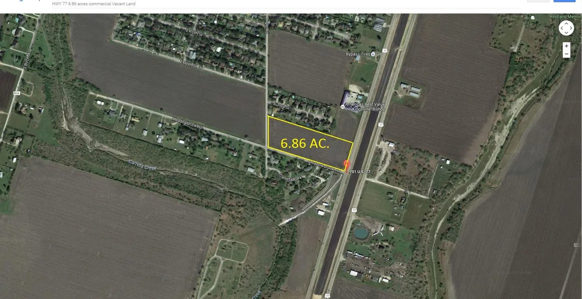 6.86 acre farm land. Zoned commercial per owner. Great opportunity for development or residential. On the feeder road of US Hwy 77 South on the West side. High traffic count. Zoning for uses must be verified with Bishop City zoning department. Utilities available.