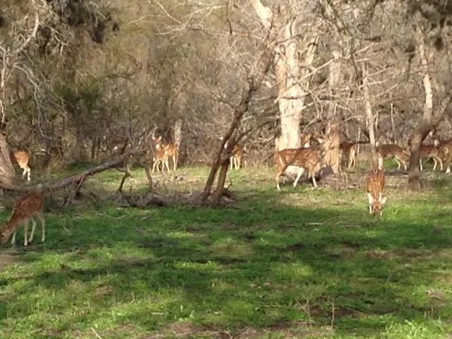 50 Acres- High Fence- Approximately 50 head of Axis deer, some fallow & some whitetails. Nueces River adjacent to West side of ranch. Two ponds, electric water well and electric meter. Large steel pole barn and enclosed shed. Diverse landscape with excellent ratio of pasture, large mature oaks, and some brush. This is a high fence ranch with rich scenery without having to pay millions= a must see!