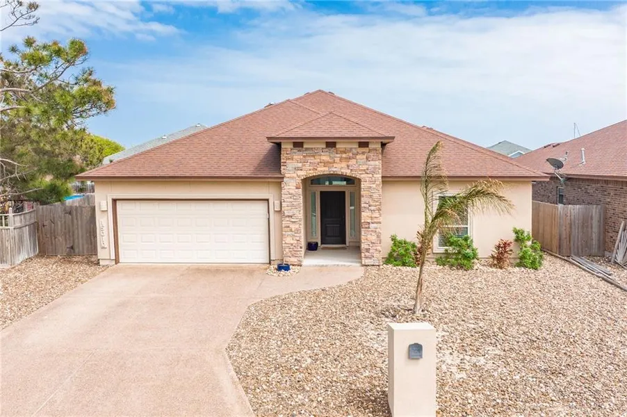 Interior lot with a WATER VIEW! One owner, clean custom home on the booming North Padre Island! This single level home offers a spacious open concept with 3 bedrooms, 2 bathrooms, split floor plan, walk-in closets, 20" tile flooring throughout and has a gorgeous water view. One of the few houses where you can walk out your front door and go fishing! The primary suite has a large walk-in closet, dual vanity, soaking tub and a separate shower. This cozy home also includes granite countertops throughout, even on the back patio! The beautiful backyard is the showstopper! Relax on the covered patio that faces southeast to allow shade and a breeze, watch your favorite team play on the TV, listen to music from the marine grade speakers, or sit at the outdoor bar enjoying your favorite cold beverage. Plus, a beautifully landscaped, low maintenance rock and professionally installed TURF yard! Cruise in your golf cart to nearby parks, boat ramps, or the beach. Do not miss out on this one!