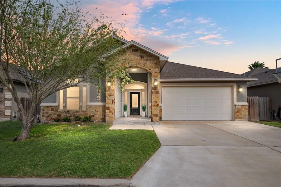 Check out this beautiful home nestled in a Cul-de-sac in the heart of Flour Bluff. No traffic noise and no through traffic! This spacious 4/3/2 at 2453sqft has the popular open concept floor plan with a split bedroom layout. This elegant home is floored with wood-look tile and complementing dark granite counter tops throughout. The kitchen boasts a breakfast bar, gas range, custom cabinets, large pantry, and stainless-steel appliances. Separate laundry has a mudroom coming off the garage, many extra cabinets for additional storage, and a dual-purpose desk area. The living area features an attractive matching electric fireplace that makes for a great conversation piece. The primary suite encompasses an oversized bedroom, and the bathroom includes dual vanities, his/her walk-in closets, walk-in shower, and bathtub. Step outback to your tiled and covered porch and enjoy the cool breeze. Your blank canvas, with plenty of room for a pool, awaits the design of your own backyard oasis!