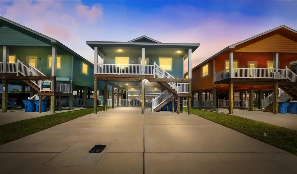 Welcome to this stunning 2021 built stilt style coastal retreat in the coveted Paradise Pointe community of Port Aransas! Elevated on pilings for breezy views and ample covered parking, this 4-bedroom, 3-bath home delivers the perfect blend of modern comfort, rental income potential, and relaxed island living. Inside, an open-concept layout connects the kitchen, dining, and living areas, ideal for entertaining or short-term rental flow. The interior features sleek white cabinetry, stainless steel appliances, and durable wood-look ceramic tile flooring throughout, offering a crisp, coastal feel with low maintenance appeal. Step outside to enjoy the private pool, which is also heated, where you can unwind after a day at the beach, or make use of the spacious under-house area, perfect for storing golf carts, beach gear, and more. Paradise Pointe is known for its tranquil atmosphere, close-knit community, and unbeatable proximity to Port A's beaches, fishing, and dining. No HOA, and a strong track record of being an income producing Airbnb. Whether you're setting it up for year round rental income or simply a premium coastal escape for everyone, this property delivers the package, recent construction, island charm, excellent location and flexible use. Schedule your showing today and envision the relaxed, elevated lifestyle that awaits at 180 Paradise Pointe.