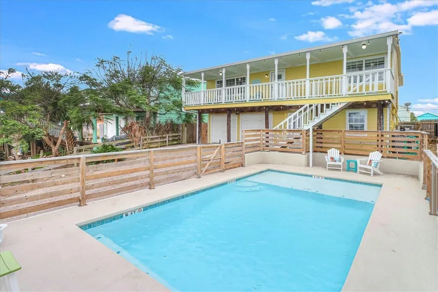 Big beachside beauty with 5 bdrms, 2 baths & a heated private pool-tucked at the end of a quiet street on the beach side of 11th so you're blocks to the sand & a quick golf cart ride to shops & eats anytime. Upstairs you'll walk into the light-filled great room with vaulted ceilings, shiplap charm & space for the whole crew to spread out. Oversized dining + breakfast bar make hosting easy. Granite counters & stainless appliances keep the kitchen crisp & functional. Step out back for Gulf peeks from the sun deck, then head down the hall to 3 guest bdrms & a nicely tiled bath, while the primary is offset for extra privacy with direct deck access. Downstairs has its own entrance with 2 more guest bdrms, an updated bath & a full 2nd living area with kitchenette-ideal for guests, teens or multi-gen stays. Out front is where the vacay vibes kick in: oversized heated pool with tanning ledge, shaded patio for chill time & a 2-car garage set up as a game room right off the pool. Tons of parking (room for 9), flexible split layout & space to host your whole crew without stepping on toes. Beach-close, pool-ready & dialed in for easy coastal living. Big bedrooms & jumbo garage leave ample space to add more baths easily.