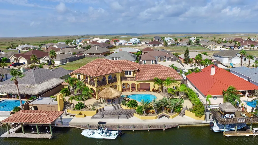 Luxuriously appointed Mediterranean style home built by James Mazoch Homes. Located on 2 East facing lots. 4,909 square feet of living area. 5 bedrooms, 4 baths, 3 car garage with one space for a boat up to 28 ft. Dramatic entry with sweeping staircase, soaring ceilings, hand troweled walls and ceilings, solid wood interior doors, Saltillo and Travertine tile floors, granite counters, surround sound inside and out, carpet in bedrooms. With this kitchen, youll never want to eat out! Granite counters, Travertine tile backsplash, Knotty Alder cabinets, Wolf six burner-double griddle gas stove, Double electric ovens, Viking dishwasher, trash compactor, built in Miele coffee machine, built in warming drawer, built in microwave, built in icemaker, pot filler over stove, walk in pantry, breakfast bar, under cabinet lighting, and ample counter space. Two living areas, sequestered theater room, office, heated pool, hot tub, covered boat lift, and enclosed storage! All located just a mile from the beach! Call Anthony Simpson to schedule a showing! 210-854-6365
