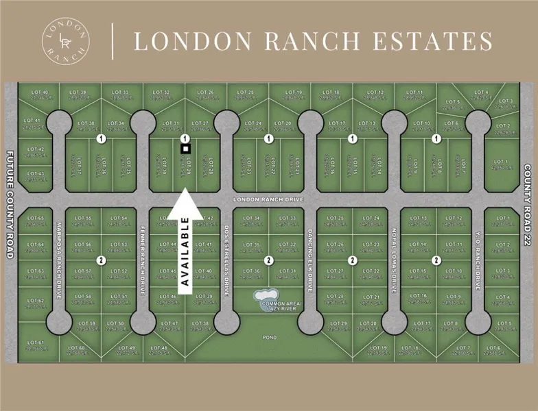 Introducing London Ranch Estates, London's newest gated community, where serene views of untouched farmland provide the perfect backdrop for your dream estate. Nestled in the heart of London, this brand new neighborhood offers expansive homesites of at least half an acre, creating a unique opportunity to design and build a custom home that fits your vision. Designed for privacy, tranquility, and elegance, London Ranch Estates features 108 spacious homesites, each thoughtfully planned to offer a balance of seclusion and community. Residents will enjoy premium amenities, including: a luxury ranch-style gated entrance for enhanced security and sophistication, a resort-style community pool and lazy river for ultimate relaxation, a scenic pond perfect for outdoor enjoyment. With no restrictions on builders or timelines, you have the flexibility to select your preferred builder and architect and start construction when you're ready. Ideally located just minutes from the highway, this prime location provides easy access to top-tier dining, shopping, and entertainment. Secure your luxury homesite today and experience the best of upscale country living! *Map is an artist's rendering and may not reflect exact site features.
