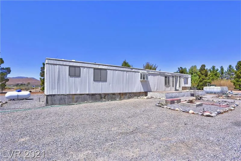 Awesome 1.14 Acre in beautiful Pahrump. This nice leveled lot has 38 trees around the perimeter making it very private and serene. Single wide Mobile Home, 2 bedrooms and 2 bathrooms in very good shape. Above ground pool comes with the house. Comes with fenced-in raised beds ready for gardening. Outbuilding/storage which also houses water pump with swamp cooler. Check out the 6ft tall chain fence all around. Grape vines and pomegranate tree. Come take a look and see for yourself. Buyer and Buyer's agent to verify information. Please follow Covid19 rules when entering the property.