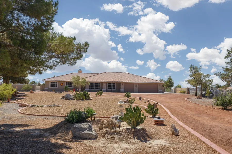 Immaculate one story on almost an acre and a half. Large living area over 2300 ft.² traditional front living rear family room. Formal dining room and eating area dining off the kitchen. Beautiful wood cabinets, stainless steel appliances walk in pantry. Wonderful separate primary bedroom with an updated large shower, double sinks & walk-in closet. Large bedrooms. Ceiling fans with lights throughout. Additional half bathroom in the laundry room. All appliances stay including water softener and filtering system. Huge 3 car garage new epoxy floor. Fresh paint exterior and interior. Landscaped beautiful yard with trees and plants fully fenced with a block wall and Gate. RV hook ups with pad gated. Exterior screened and sunroom off back patio. Additional dog run area gated. This home has too many features and beautiful upgrades to list completely immaculate. Absolutely wonderful neighborhood less than 10 minutes to shopping, casinos, and restaurants. 45 minutes from Las Vegas.