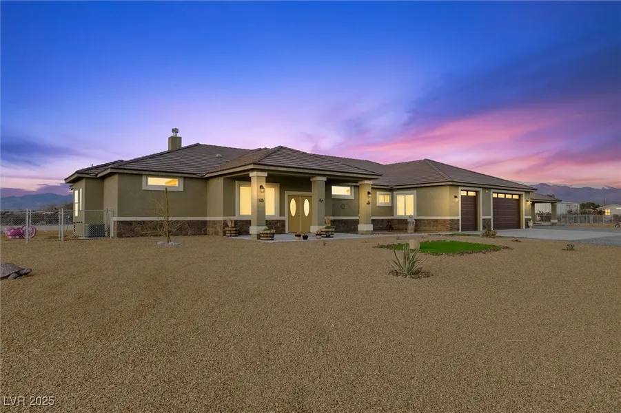 Set on 2.43 acres, this stunning 2021 custom estate spans 3,542 sq ft, built with 2x6 construction and extra insulation for quality and efficiency. The gourmet kitchen features a Thermador cooktop & oven, Viking commercial fridge/freezer, and Kohler farmhouse sink, plus a 10-ft island and custom lighting for style and function. Enjoy soaring 10-ft ceilings, 6" crown molding, and elegant lighting. With 5 bedrooms, 3.5 baths, and a game room, this home blends luxury and comfort. The primary suite includes a hidden safe room for added security. A 576 sq ft guest house adds flexibility. Outdoors, enjoy a 40-ft fire pit, volleyball and tetherball courts, a playground, archery range, two Tuff Sheds, and a raised garden. Just 45 minutes from Las Vegas, this estate offers privacy and luxury, with wineries, golf, and outdoor adventures nearby. Schedule your private tour today!