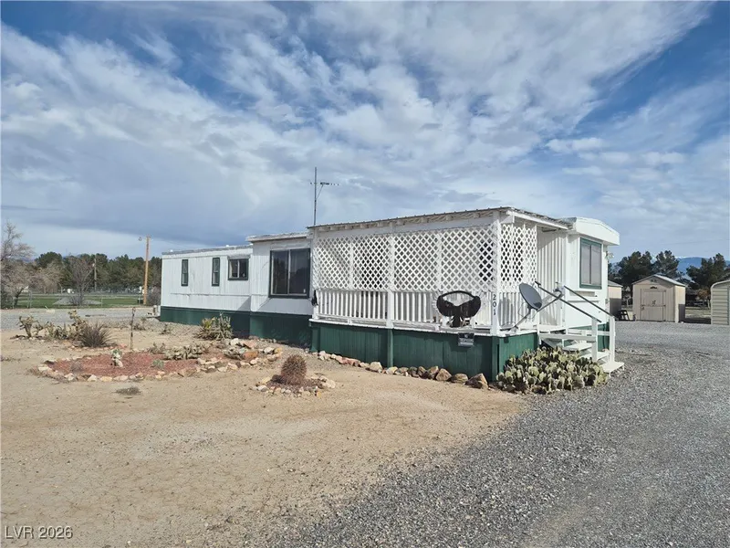 Versatile Pahrump Property with Expansive 6-Car Garage & Mountain Views. This 2-bedroom, 2-bath manufactured home offers comfortable desert living with a porch, deck, and patio—perfect for taking in the peaceful setting and sweeping mountain views. The property is fully gated and features easy-care desert landscaping, two sheds, and all appliances included. Sold with an adjacent graded lot for a combined 2.16 acres, this property is ideal for RVs, ATVs, side-by-sides, and other desert toys, with RV hook-ups already in place. The true highlight is the enormous 6-car tandem garage, providing exceptional space for vehicles, tools, equipment, or recreational storage—an ideal setup for car enthusiasts, hobbyists, or anyone needing serious workspace and storage. With a fenced yard, wide-open views, and endless potential, this property captures the freedom and lifestyle that make Pahrump living so desirable. An exceptional opportunity you won’t want to miss.
