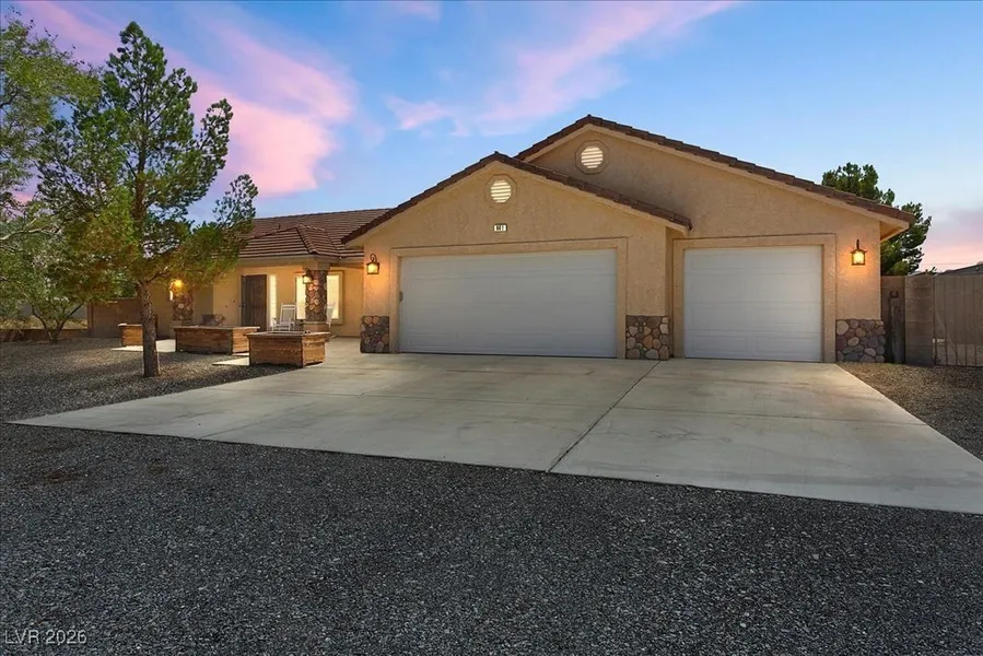 Welcome to this beautifully remodeled, modern single story home on nearly a half-acre lot in Pahrump—NO HOA! This 2-bedroom, 2-bath residence offers an open floorplan with no carpet and stylish LVP flooring throughout. The upgraded kitchen features custom cabinetry with roll-out shelves, upgraded counters, and all appliances included. Recent improvements include new toilets and thoughtful modern finishes. Enjoy the flexibility of a rare 3-car garage and expansive outdoor space with room for toys, gardens, or future expansion. Clean, contemporary, and move-in ready—this property offers comfort, functionality, and freedom with no HOA restrictions.