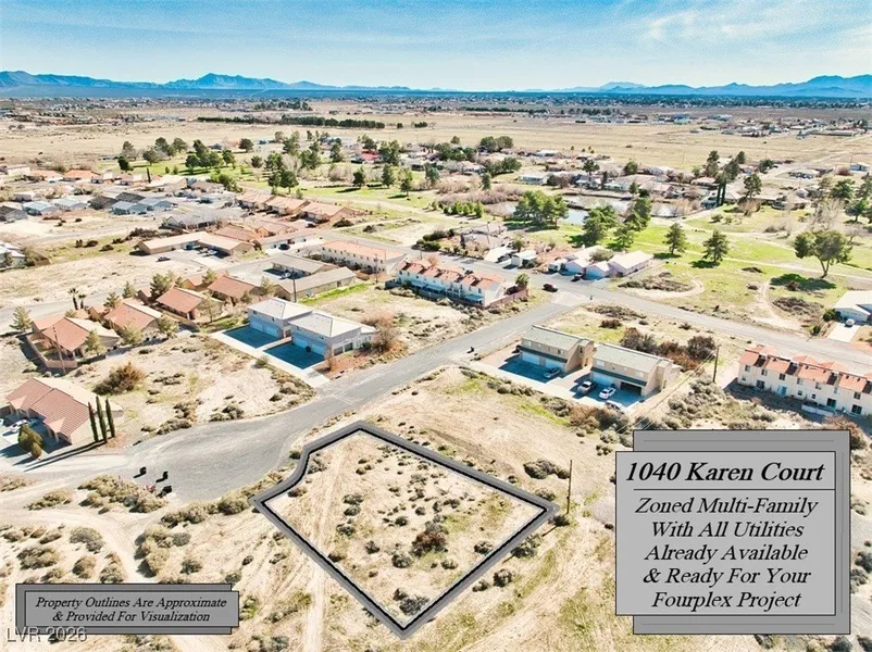 A Marvelous .37 Acre Parcel With All Utilities Already At The Property Line, Zoned Multi-Family & Ready Fourplex Project!~~1040 Karen Court Is Centrally Located Off Of Bourbon St. & In An Established Four-Plex Community With New Construction In The Area~~~Power, Water & Sewer Are All Already Available With NO EXTENSION FEES & The Property Offers Approximately 16,000 Sq. Feet For Your Plans~~~With A Land Price Of Less Than 14k Per Unit & Is An Excellent Selection For Your Pahrump Project~~~Multi-Family Parcels Are In High Demand, Prices Continue To Rise & It Is An Outstanding Time To Lock One In~~~Submit An Offer & Secure This Wonderful Property Today!