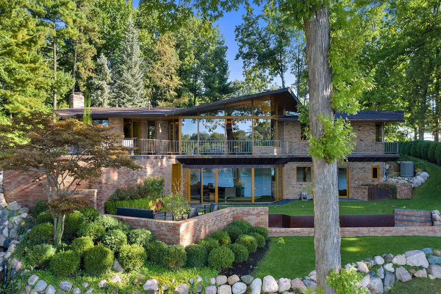 Rare Harold Turner Stunner! Frank Lloyd Wright's go to builder. Located on a private road with spectacular views of Lower Long Lake, this 4 Bedroom, 4.1 Bath, 3996 SF home has been renovated without sacrificing the aesthetic. Updates include: new foam insulation, roofing, copper gutters, heating/cooling system/heated floors, energy efficient windows and smart home light system. Brick and groove planks clad walls/ceilings and 4 roof balcony overhangs, floor to ceiling windows and 3 fireplaces throughout. Gourmet Kitchen with a pecky cypress T&G plank angled ceiling with a precise starburst motif, new cabinets, porcelain backsplash, stone counters, Dacor stove, Miele dishwasher and Liebherr fridge, island with hidden TV and dining area. Study, walk-out family room and stunning living room with breathtaking views. Primary Retreat boasts slate and sloped composite gold leaf ceiling, custom walnut bed and a lovely bath. Professionally landscaped yard with waterfalls, lush trees, patio and 3-car garage.