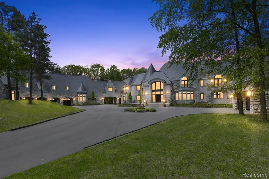 Impeccable Estate Masterpiece built by Mosher Dolan featuring over 30k sq ft! Set on 8 secluded, private acres, one-of-a-kind garage that holds up to 15+ cars, full pull through with 14ft doors to house a 90-foot-long motorhome/trailer, custom car lift that rises from the basement showroom! Elegant exterior design features natural stone, motor courtyard, slate roof, grand limestone entry way with floor to ceiling windows. Int features stunning 2 story foyer with grand chandelier, marble flooring, 3 story illuminated Onyx stone, Extensive custom craftsmanship from wood flooring designs with multiple variations of hardwood species, ceiling details, hidden passage ways and much more. Custom Anderson gunite indoor pool with waterfall, hot tub, mosaic accent tile, 2 full changing rooms, custom bar perfect for entertaining/hosting events! Primary suite is unmatched featuring stunning master bath with oversized dual walk in shower, imported tile, jacuzzi, lrg walk-in closet with organizers, center island, in room laundry & mini kitchenette, attached library/office, secret doors leading to poker room with full bar overlooking auto garage/lift, as well as balcony leading to pool area, formal sitting room with limestone fireplace, truly a 5 star primary suite. All guest rooms are en-suited with walk-in closets and beautiful views. 3 laundry rooms, lrg Chefs kitchen with custom cabinetry, built-in paneled Fridge/freezer, warming drawers, induction cooktop paired with indoor grill. Whole House Generator. To many amenities to list! Once in a lifetime opportunity to own an estate of this caliber.