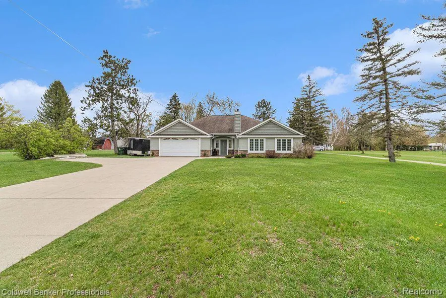 Custom Built Lake Orion Craftsman Style Ranch with open floor plan and breathtaking view of 100' of frontage on Square Lake. Covered brick paver patio will be your favorite place to entertain on almost 2 private acres! Heated sidewalk safely leads to inside this wheelchair friendly home. Open foyer welcomes you to the dining room adorned with Cherry/Maple hardwood floors, crown molding and 9' ceilings. Spacious kitchen counters pair well with maple cabinets, half circle island great for casual dining and ceramic tile floors. Thru the recessed, leaded glass French doors awaits a primary suite with walkin closet and powder room - currently used as a flex room. Gas fireplace warms the brightly lit family room complete with Antcliff custom windows. First floor laundry room. Stylish garage with epoxy floor and accessible attic space storage. 2 zone furnace, tankless on demand hot water, 2 ele...