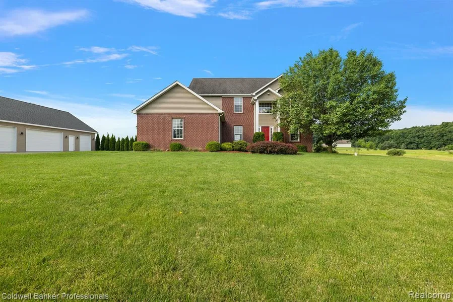 This stunning property sits on a sprawling 2.5-acre lot, complete with a serene pond and breathtaking views. The kitchen is spacious and seamlessly connects to a the 2 story living room and a beautiful deck to relax and enjoy the scenery. Recent upgrades include new furnace and A/C in house and 2nd garage(2022), sump pump(2022), a beautifully stained deck(2024), and interior paint(2021). Additional storage is available in the massive second garage. Buyer/buyer agent to verify all information.