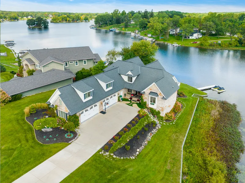 This stunning lakefront home on All-Sports Dixie Lake offers over 6,500 sq. ft. of living space PLUS guest suite. Desirable 300+ feet of peninsula shoreline on ALL SPORTS DIXIE LAKE. Located in Clarkston Schools, the custom-built home blends casual elegance with modern luxury. The chef’s kitchen features granite countertops, custom cabinets, and new high-end stainless steel appliances, including a Bosch touch-screen refrigerator. Elegant finishes like a Swarovski birdcage chandelier, fieldstone, engineered hardwood, and travertine floors add charm throughout. Enjoy breathtaking lake views from floor-to-ceiling windows, the stamped concrete patio, and a spacious wrap-around deck. The main floor offers expansive living areas, including a great room, kitchen, and dining area. The primary suite is a luxurious retreat with a walk-in travertine shower, sitting room, and serene water views. The...