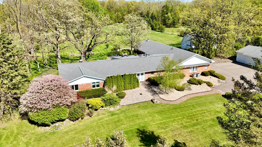 Sprawling, fully updated South Lyon ranch on 4.33 wooded acres, offering 5,360 sq ft of modern European-inspired design. This 3-bedroom, 3-bath home features exposed beams, luxury vinyl plank flooring, and expansive windows that fill the space with natural light. The oversized living room is ideal for entertaining, hobbies, or relaxing. A spacious kitchen with new Bosch appliances (2024) opens to a light-filled dining area with skylights. The primary suite includes a gas fireplace, spa-like bath with walk-in Euro shower and soaker tub, plus a generous walk-in closet with integrated laundry. All bathrooms are fully renovated with walk-in showers. Enjoy outdoor living with a screened-in trex deck (2020), and multiple patios, including a hot tub. Attached 2-car garage, plus a 4-car detached garage with wood workshop, golf simulator entertainment space, and additional storage, plus a separat...
