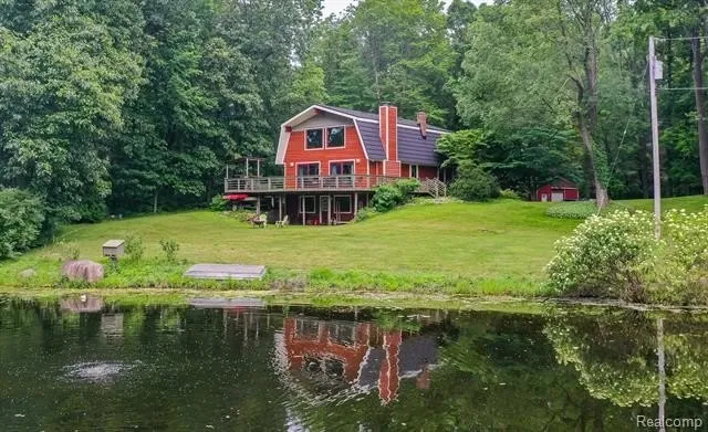 Nestled on over 15 picturesque acres with a winding drive, private pond, and scenic trails, this charming farmhouse-style colonial backs directly to Indian Springs Metro Park, offering unparalleled privacy and access to nature. A true retreat, this home seamlessly blends rustic charm with modern updates. Step inside to a spacious kitchen featuring a classic farm-style sink, butcher block countertops, a huge island with a gas cooktop and seating area, and stainless steel appliances, including a new refrigerator (2024). The soaring ceilings and large windows in the great room flood the space with natural light, while the open-concept eat-in kitchen flows effortlessly to the deck—perfect for entertaining. Just steps away, a generous living room boasts an incredible stone wood-burning fireplace, creating a cozy atmosphere. The first-floor primary suite offers a large walk-in closet and an adorable en-suite bath with a shower. Upstairs, enjoy all-new laminate flooring and trim, three bedrooms (one currently used as an office), and a full bath with a jetted tub and shower. The walk-out lower level features a cozy den and bar area that opens to a patio—ideal for relaxing or hosting guests. Outside, the expansive deck is equipped with a grilling station with electricity, making outdoor dining a breeze. Sit back and soak in the breathtaking views while watching wildlife in your own private sanctuary. Recent updates include a premium shingle-look Erie metal roof with insulation and a lifetime warranty (2022), well pump and pressure tank (2024). Great room professionally painted (2025). Durable Hardie board exterior. The 30 x 40 pole barn with electricity and a chicken coop complete this incredible property, offering endless opportunities for hobbyists or homesteaders. Don’t miss your chance to own this one-of-a-kind country escape! See the 3D tour for a virtual walkthrough.