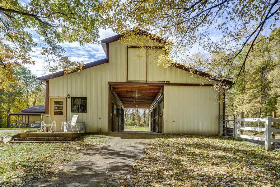 Set in a wooded sanctuary with 3,751 finished sq ft, this home is a recreational residence that appeals to the equestrian masses. On 14 acres, with riding trails, 7 pastures, a drive thru Pole Barn, a Horse Barn with 3 Stalls and an 80x110 Outdoor Arena, you will never run out of horse-related activities. The entryway of the home greets you with formal dining and an office with detailed french doors. Continue into the kitchen to find a large butcher block island and a breakfast nook. The open concept living space includes vaulted ceilings, a gas fireplace and marble accents. Vaulted ceilings continue on into the Master Suite, providing luxurious living with an updated Master Bath, jetted tub and large walk-in shower and closet. The finished walkout basement includes rec space with kitchenette, workout room, a full bath and bedroom. The amenities are endless and the beauty is abundant, you dont want to let this property pass you by!