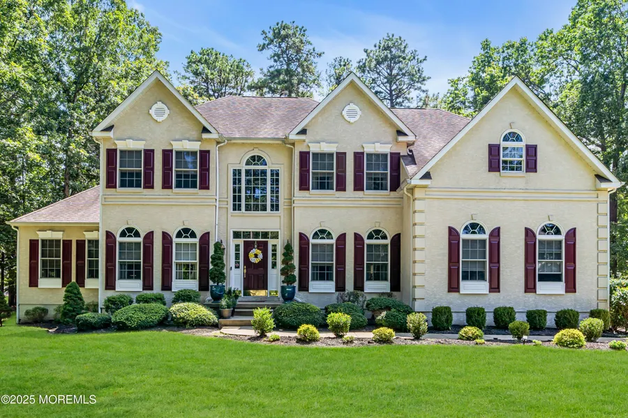 Discover refined living in this 4-bedroom, 3.5-bath Newport model, perfectly situated in the sought-after Majestic Woods community of Jackson. Set against a backdrop of preserved woodlands, the property offers rare privacy and a serene, landscaped retreat. From the curb, the home commands attention with its stucco exterior, elegant Forest Green shutters, custom millwork, and a distinguished front entry. The extended driveway provides ample parking and leads to an oversized two-car garage, complete with epoxy flooring-ideal for hobby space or additional storage. Inside, a two-story foyer greets you with streams of natural light and a dazzling Swarovski Crystal chandelier, thoughtfully equipped with a motorized lift. Solid oak floors, custom trim, and fine architectural details create a timeless first impression throughout the main level. The open-concept design offers multiple entertaining spaces: a formal dining room with decorative columns, a bright living room with tray ceiling and panel molding, and a sunken family room highlighted by a vaulted ceiling and cozy gas fireplace. At the center of the home, the chef's kitchen shines with stainless steel appliances, a Sub-Zero refrigerator, 42" cabinetry, Corian countertops, and a large center island. Sliding glass doors open to a three-tier composite deck perfect for summer gatherings or quiet mornings surrounded by nature. Upstairs, the luxurious primary suite includes dual walk-in closets and a spa-inspired bathroom featuring separate vanities, a soaking tub, and a glass-enclosed shower. Three additional bedrooms offer generous space for family, guests, or flexible use. The unfinished basement provides endless potential whether for a gym, home theater, or expanded living space. Technology upgrades throughout include CAT5e wiring, a central network panel, and hidden Wi-Fi repeaters for seamless connectivity. A 1-year home warranty is included, providing added peace of mind for the new owner. Located minutes from I-195, the NJ Turnpike, shopping, dining, and local favorites like Six Flags Great Adventure, this property offers the perfect blend of privacy and convenience. Don't miss the opportunity to own this exceptional home in one of Jackson's premier neighborhoods.