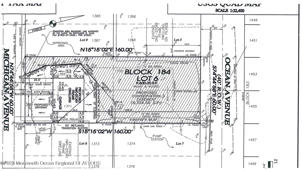Just one block to the open bay - this is a double lot - stretching from Ocean Ave to Michigan Ave. Zoned one family residential. See attached documents and proposed plot plan. Township of Ocean requires a variance to build... 20 ft front and rear setbacks, and side setbacks with minimum of 15 ft total- divisible to be no less than 5 ft on one side. DEP requires a permit - previously granted but requires renewal.