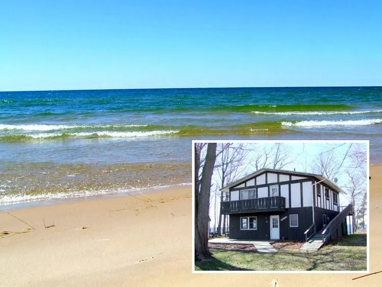 ONLINE REAL ESTATE AUCTION June 23, 2015 from 8 am - 2 pm. Opening Bid only $150,000. This property features a two-story home on a gentle bluff overlooking the Lake with 93 feet of frontage on a private, half acre beach below. Totaling 1,920 square feet over two floors, the second story includes a bedroom, bathroom, laundry, and kitchen paired with a spacious, open living room and dining room area highlighted by a suspended wood fireplace and two sets of triple-sliding glass doors for expansive views of Lake Michigan and access to the large upper deck. Lower floor has a recreation/family room, second bathroom, and three additional bedrooms, including two facing Lake Michigan with sliding glass doors for views and patio access. Two sheds, appliances and furniture are included. The private beach is surrounded by other private beaches and one beach that is shared by only 3 other landowners, creating a relaxing and private beach experience. Also included is a 1/4 interest in the community beach lot that lies adjacent to the property's private beach. Neighbor just north of the cottage is currently allowed to share the well on this property under an informal arrangement. Lake Michigan recreation opportunities, spectacular sunset views, and a lifetime of great memories await you! Please see our website for more info, photos, and terms.