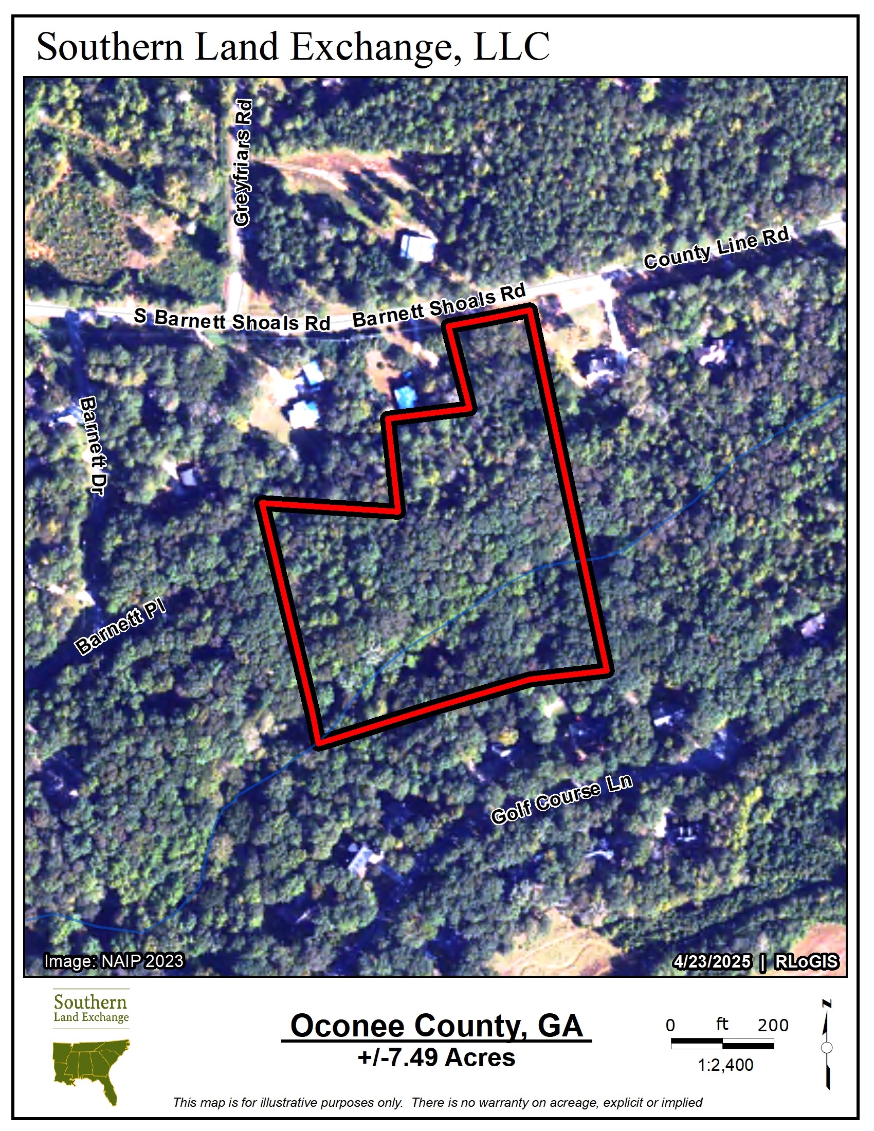 Southern Land Exchange is proud to present this 7.49 acre land lot in highly desirable Oconee County! The property is mostly wooded with a nice open area near the entrance. There is a beautiful branch off the Oconee River toward the back of the property with both sides of the branch located on the subject property. There is approximately 160 feet of paved frontage on Barnett Shoals Road. The property is conveniently located only 8 minutes from Watkinsville and only 20 minutes from downtown Athens. Something to note is that Veal Cemetery is located on the property. There are multiple potential build sites, possibility at the road or further back on the property. The topo is steep in areas, but could make for an excellent basement build. The property is priced very competitively and is possibly the best priced small acreage tract in Oconee County in the 5-10 acre range. Call Travis Ebbert for more information at 706-614-8840.
