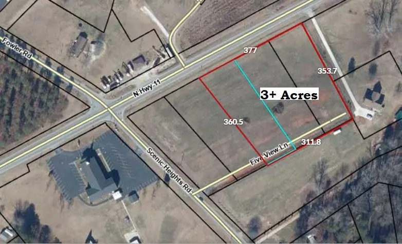 Three acres, made from combining three plots (TMS 148-00-01-025, 148,00-01-024, and 148-00-01-019) with over three hundred feet of road frontage on Highway 11 and road access through Five View lane to Scenic Heights. Unrestricted and ideal for commercial development. Could also be residential. Some mountain views, pressurized sewer line across the road, feel free to reach out to sewer authority on whether may be accessed. Natural Gas, city water, highspeed internet, and great topography. Ideal for service station, boat storage, mini-warehouses, retail or dining. Three current septic permits on the property for 1000 gallon systems. This is a must see.