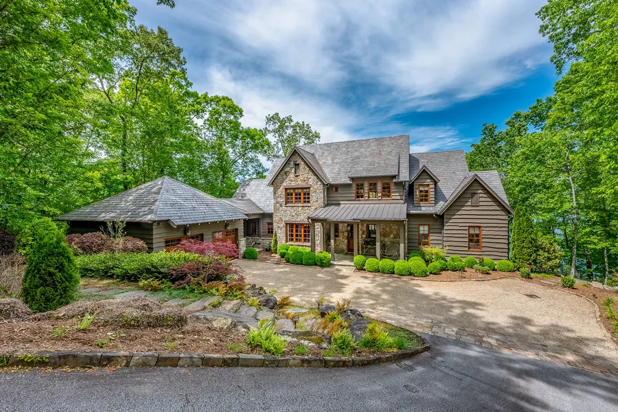 A classic custom home of the finest design, materials and craftsmanship. A Caldwell Cline design expertly crafted by The Berry Group consisting of old-world wavy pine siding, extensive custom stone work, French mahogany windows and doors, and adorned with a slate roof. 7163 sqft of custom interior design over reclaimed wide plank distressed oak flooring, coffered beam and stained cathedral ceilings and multiple stone fireplaces. Extensive covered, screened and open decking and porches on both upper and lower levels provides multiple inviting entertainment areas and artfully frames the rare panoramic lake and mountain views. The nursery like landscape with select plantings and ferns throughout the property is beautifully designed with extensive hardscape and landscape color leading to a rare large flat waterfront entertainment area, which includes a large circular flagstone gathering area...