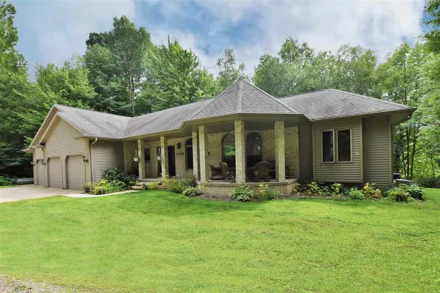 Tucked-away Treasure on 10+ acres. Walkout ranch with beautiful arched windows and entries. Detailed, built-ins and custom workmanship throughout. Gorgeous granite kitchen open to living room and dining area. Master suite with whirlpool tub, walk-in closet, and door to deck overlooking the wooded backyard. Lower level boasts second family room with fireplace, enormous bedroom, full bath with tile shower, work out area, and plenty of storage. Over-sized outbuilding. Overhead door equipped for most large RVs. Wind up the drive and take the fork to the right to reveal this private retreat!